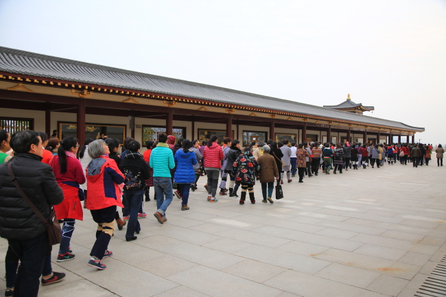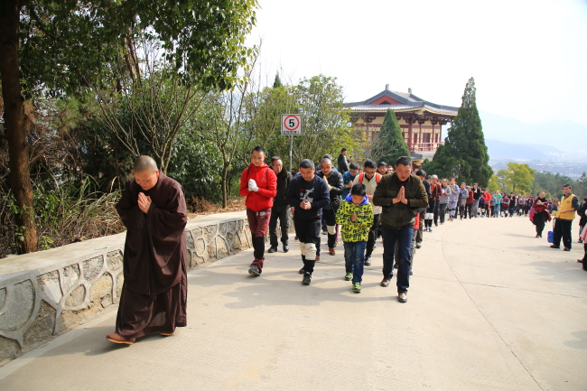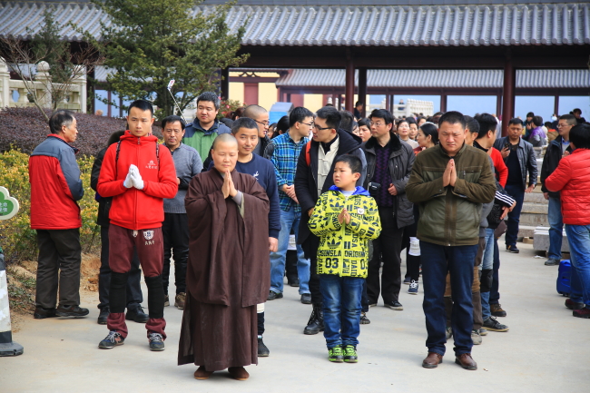 2016年新年伊始,净土苑就迎来了一行150人的武汉莲友朝圣团队。与以往的拜佛队伍不同,该团体并没有一个固定的组织。据领队王居士介绍,朝拜团队的成员均为一个名为“净土莲池”QQ群里的武汉网友。大家因为学佛而在网络上相遇,因为专修净土最终相聚在了一起。群里的成员与东林寺有着颇深的缘分,其中有不少人曾在祖庭做过义工、打过佛七。在元旦前,王居士在群里发出了元旦朝拜东林大佛的号召,响应颇为热烈,由于人数过多,最终不得不限制在150人。