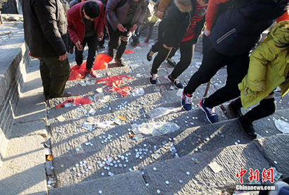 香客扎堆到泰山祈福,台阶上洒满零钱。(图片来源:中国新闻网)