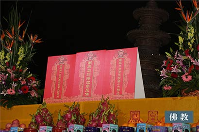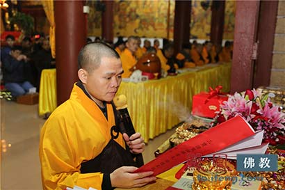 维那师宣读“三宝证盟供佛斋天功德文疏”(图片来源:凤凰佛教 摄影:顿博)