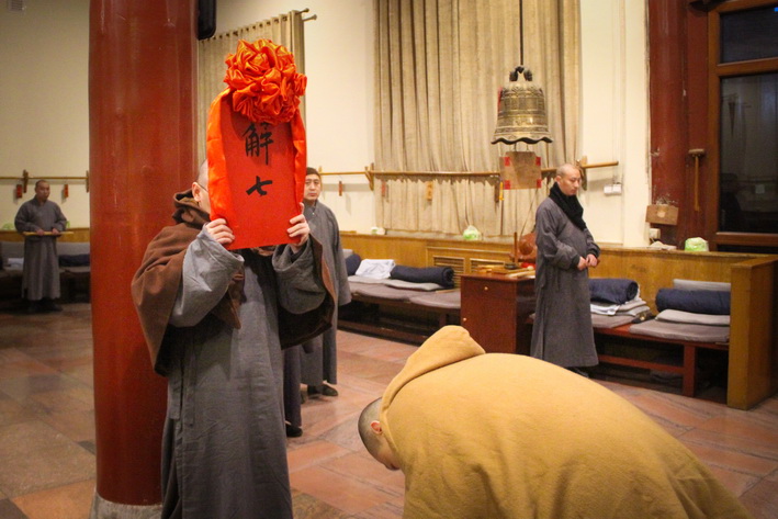 随后,法师大喝一声:“解”,柏林禅寺冬季禅七圆满解七。