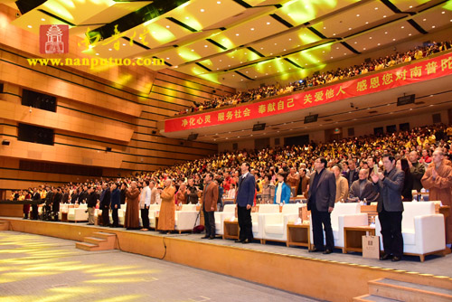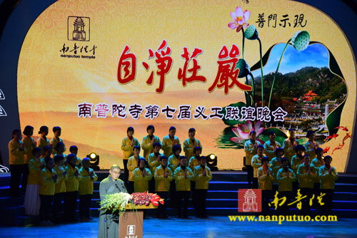 2016年1月30日晚19时30分,“普门示现·自净庄严”——南普陀寺第七届义工联谊晚会在厦门国际会议中心海峡会议厅举行。来自厦门市各界领导嘉宾、市佛教协会领导、厦门各寺院负责人、南普陀寺常住执事、闽南佛学院法师及南普陀寺义工数千人共同观看了精彩的节目演出,享受了一场视觉、听觉的盛宴。晚会由南普陀寺义工部部长圆满法师主持并致开幕词,厦门市佛教协会会长、南普陀寺方丈、义工导师则悟大和尚出席晚会并致辞。