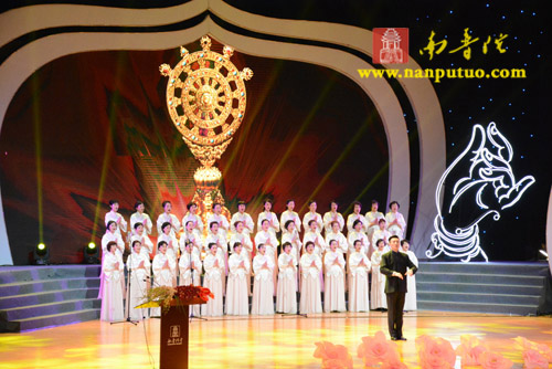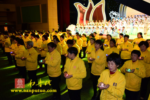 本次晚会节目均由南普陀寺义工自导自演,义工们发心以艺术供养三宝,将学佛心与舞台表演融为一体,生动地诠释了南普陀寺义工“无缘大慈,同体大悲”的精神。晚会开场时,南普陀寺无尽意梵呗艺术团的全体成员合唱了《三宝歌》,和谐、自在的天籁之音,浑然天成,诠释了深奥的佛教义理。舞蹈《水中莲花》把气氛推向高潮,义工们优美的舞姿,让在场的人连连称赞,赢得了阵阵掌声。义工菩萨们表演了丰富多彩的文艺节目,现场气氛热烈、祥和。最后,500名义工手捧莲花灯,一盏盏莲花状的灯组成一条明亮的光带,仿佛为大家带来光明,带来希望。