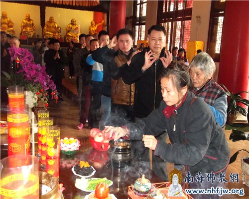 1月29日上午10时许,由海南省佛协副会长、海口泰华庵住持成道法师主法,数百名居士和义工怀着大欢喜心齐聚泰华庵大雄宝殿,齐诵“礼佛忏悔文”和“拜愿文”等佛教经典并一一拈香,使每一个到场的人心灵得到一次净化。