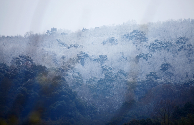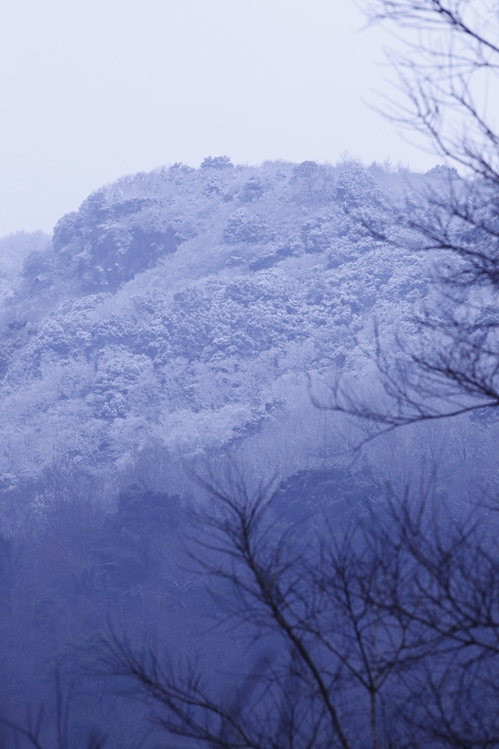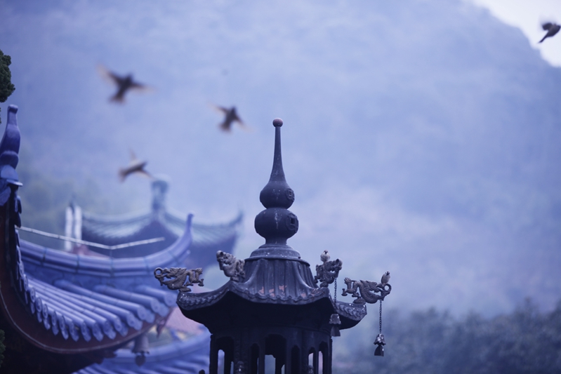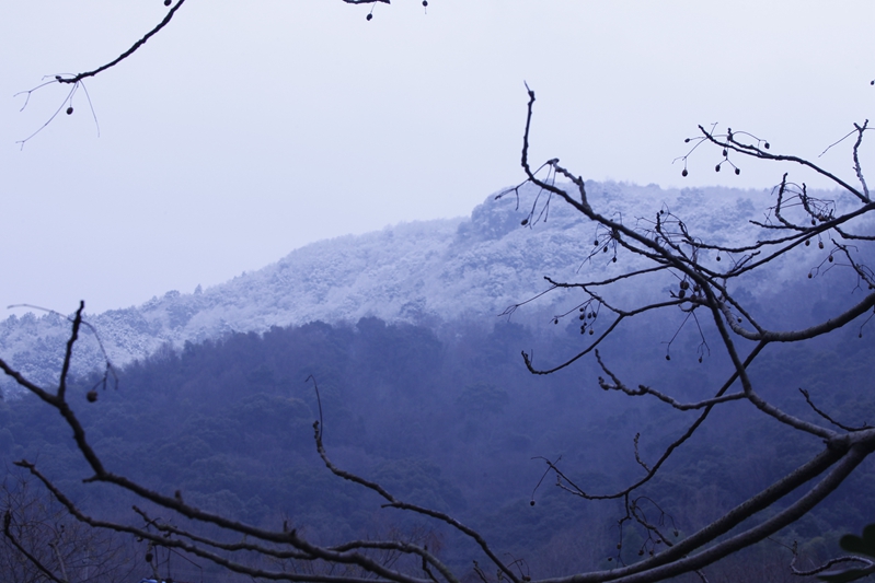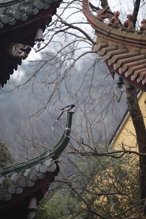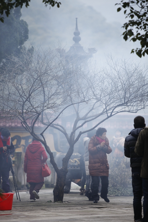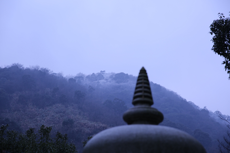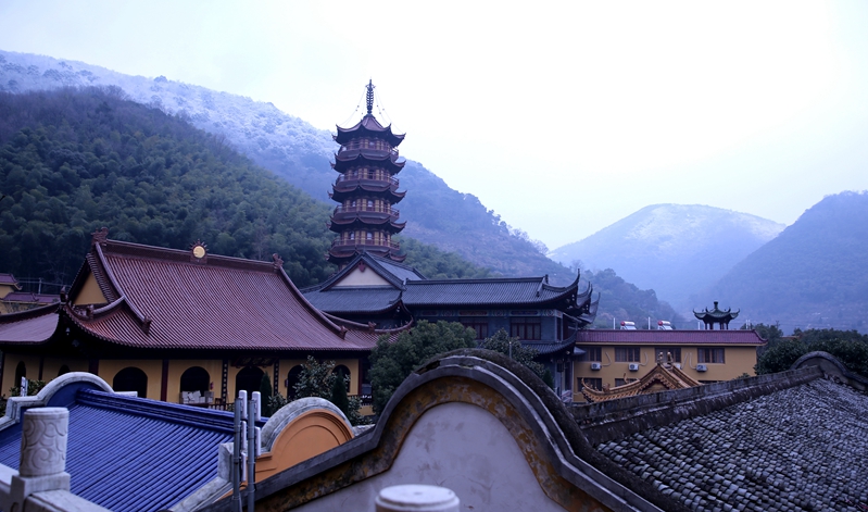 寒潮去时未远,慧日寺不远处的高山之顶,覆盖着皑皑白雪,卓然如尘外仙境。白雪以下,千松成林,如泼墨,似青云。慧日寺里,腊梅清香恒久不绝,孔雀或啼鸣,或开屏,为法会增添着庄严。