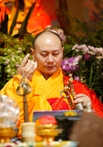 法会开始,大家虔诚念诵“普召请真言”,因功德力使然,一切有缘众生刹那来到道场,饱餐美食,畅享佛法。传喜法师开示,既然以佛力来到道场,就不要再相互仇恨、怨恨,各个都要回光返照,自我反省,放弃内心的负面力量,打开心灵的枷锁。随着“解怨结真言”,众生们放下内心的怨仇,获得自在与解脱。观想着亮晶晶、清凉的水,念诵“开咽喉真言”,饿鬼道众生咽喉的火熄灭,畅饮着清凉的甘露。