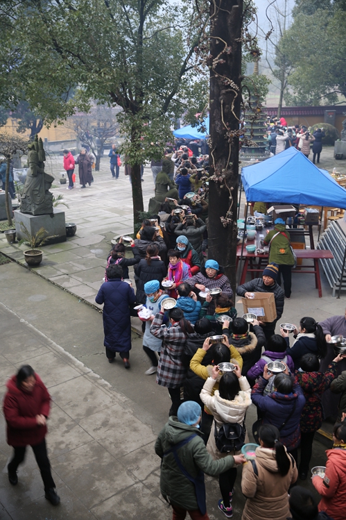 大家专心念着六字大明咒,与观音菩萨的大悲心相应,来到火供炉前烟供施食。食物燃烧,香味萦绕,人心的慈悲温暖令寒冬畏缩。三圣殿前,义工菩萨们精心烹制出的素食菜肴摆满了十张桌子,鲜美的菜肴,沸腾的火锅,甜美的饮料,丰盛的供品,琳琅满目,以供祖先们以及一切众生。