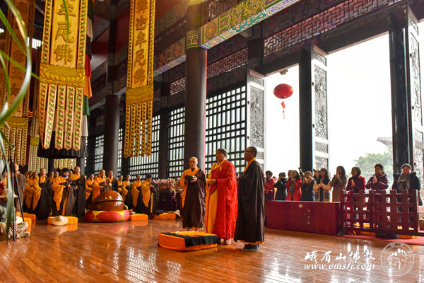 上午九时,祈福法会在大雄殿举行,法会礼请峨眉山方丈永寿大和尚主法,法会如法如律、庄严圆满。
