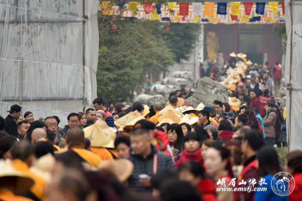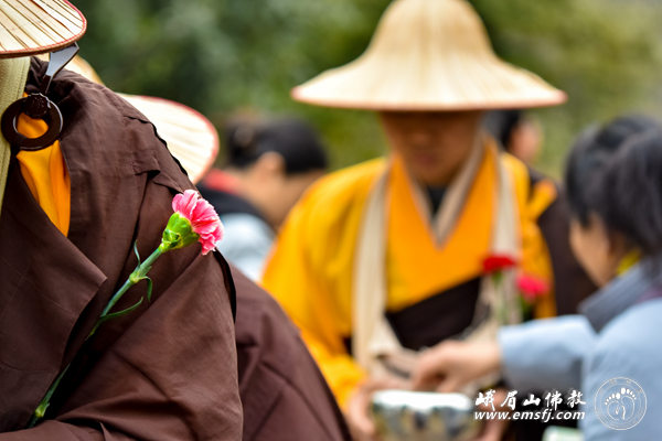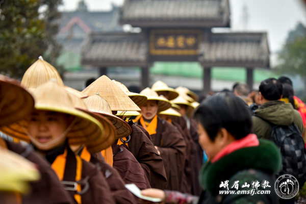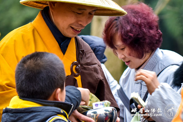 行进的法师们,头戴竹笠,身被衲衣,手托钵盂,脚踏芒鞋,稳健行走,而早已恭候多时的十方善信在道路两旁排起了长长的队伍,纷纷向法师手里的钵盂中投放善款和各种供养品,他们当中有满头白发的老人,有虔诚的年轻人、中年人,还有由大人带着的稚气的小朋友;有峨眉本地的居士,有从外地赶来朝山的香客,大家有备而来,以一颗虔诚恭敬之心等候在行脚路的沿途。行进的队伍中只听佛号声声,铜板叮当,场面庄严清净、动人心弦。