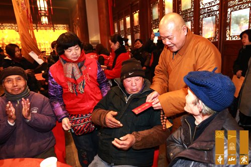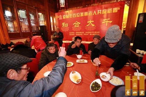 此次前去寒山寺赴宴的120多位孤寡老人,大多是70岁以上的老人,其中80岁以上高龄的有10位,老人们都因种种原因,未婚或者离异,无儿无女,独自一人生活,无人照料,有人还身患多种疾病。年关将至,人人盼望回家团聚,但孤寡老人已没有亲人可以相聚!寒山寺与和合文化基金会此次活动的举办,也是希望能给老人们带来一个温馨美满的新年,更希望通过这样的活动唤起更多的社会贤达与有志之士,关心关爱老人,让老人过一个幸福美满的晚年。