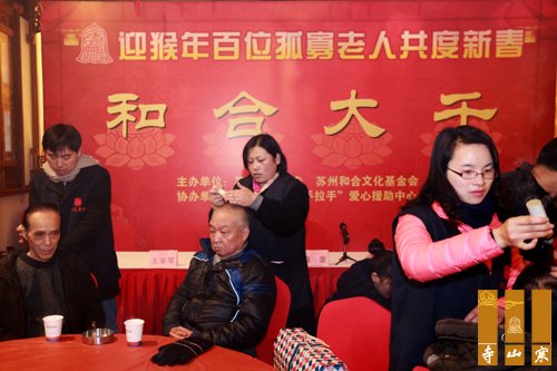 2016年1月29日上午(农历十二月二十日),猴年春节来临之际。寒山寺与和合文化基金会,携手苏州姑苏区“手拉手”爱心援助中心举办此次“关爱孤老 传递温暖”百位孤老猴年迎新活动,120多位低保孤老在三十多位志愿者的陪伴下,陆续到达寒山寺罗汉堂,每位老人脸上洋溢的笑容幸福而又满足。