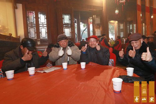 寒山寺为老人准备了一桌可口的素餐宴请百位老人,领导嘉宾给老人们一一送上新年红包及新年礼品。老人纷纷举起大拇指为此次活动点赞,活动现场洋溢着浓浓的温馨和喜庆。同时,秋爽大和尚向各位老人表示真诚的祝福,祝愿老人身心健康,万事如意。也向各位领导、老人及嘉宾们拜个早年。