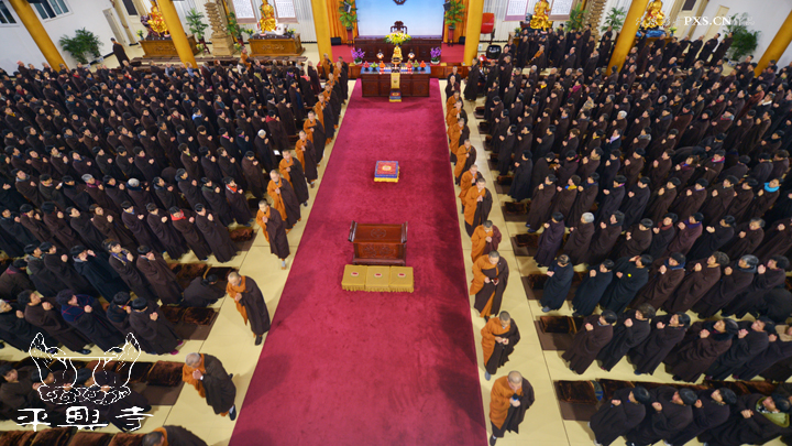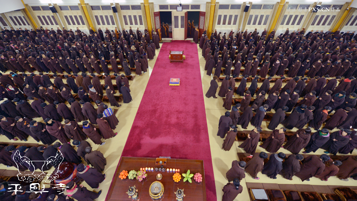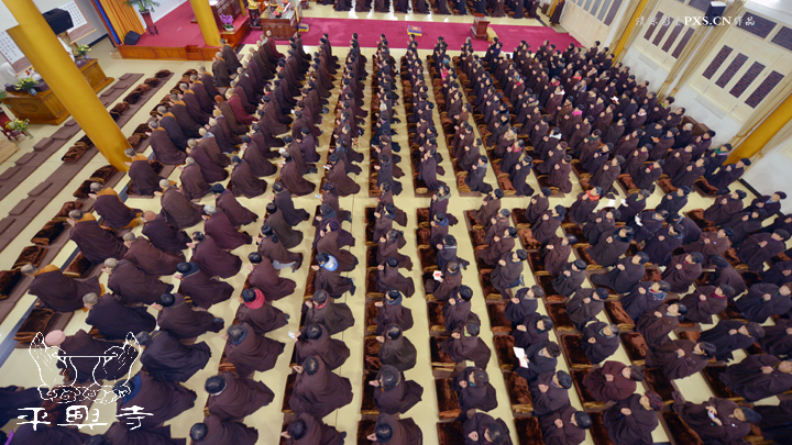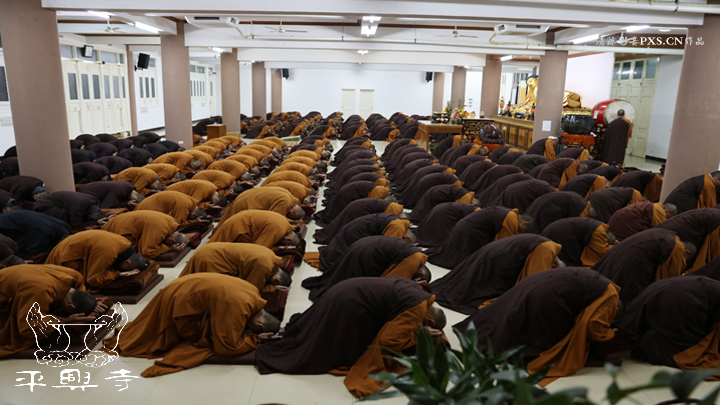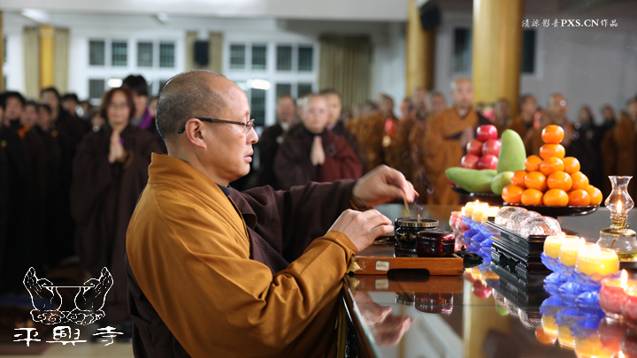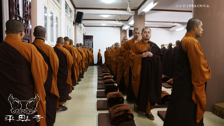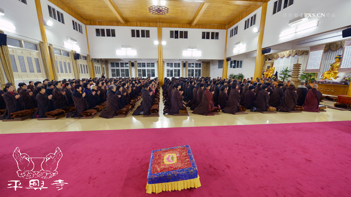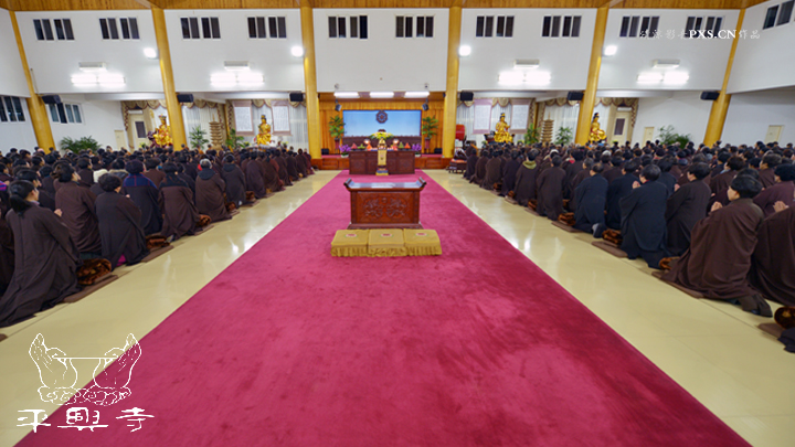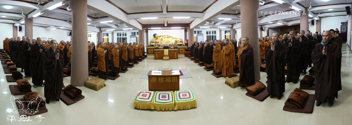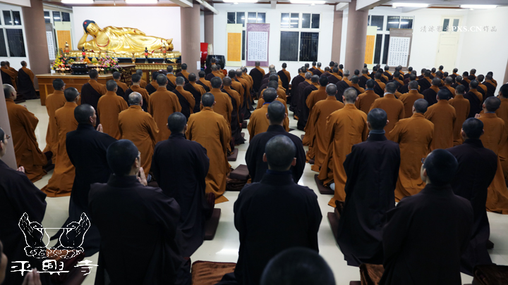 二零一五年农历十一月初八晚上五点四十分,平兴寺常住冬季佛七于卧佛殿正式起七。是日晚五点四十分,平兴寺常住三百多师父们集于卧佛殿,由界诠法师拈香主七,大众一起唱莲池赞、赞佛偈、诵《阿弥陀经》,念佛、绕佛,佛七正式开始。