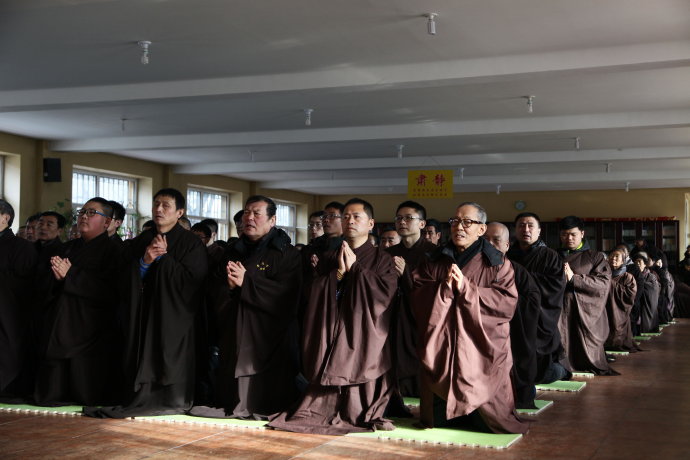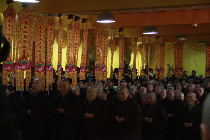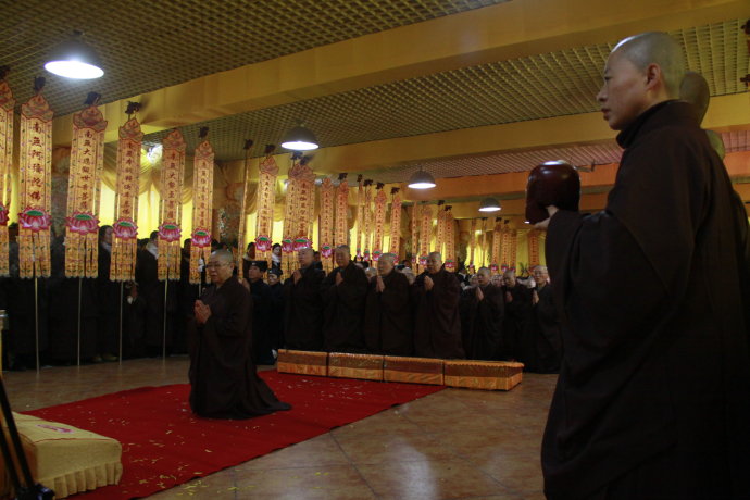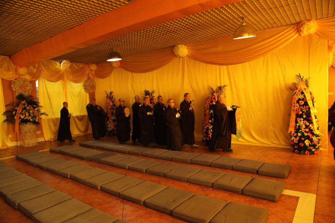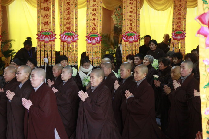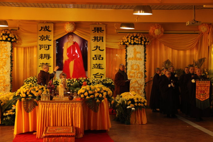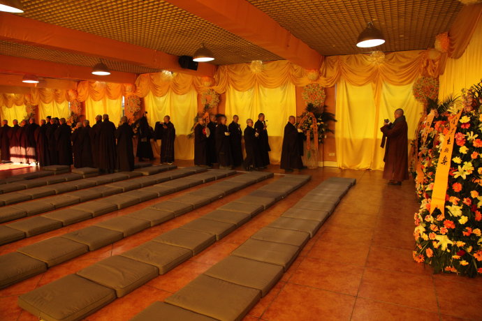 衍天法师率领果城寺两序大众举行了庄严的安灵仪式。在虔诚的叩拜中,在氤氳的香雾里,与会大众虔诵经文,礼拜老法师法体,念佛传供,祈愿仰仗诸佛菩萨的慈悲愿力,上果下成老法师莲增上品,成就金身,速生安乐刹土,速成无上菩提!