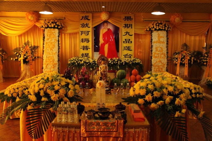 追思堂内,老法师的法体周围摆满了鲜花,老法师法像上慈祥的笑容带给人们清净与安详。