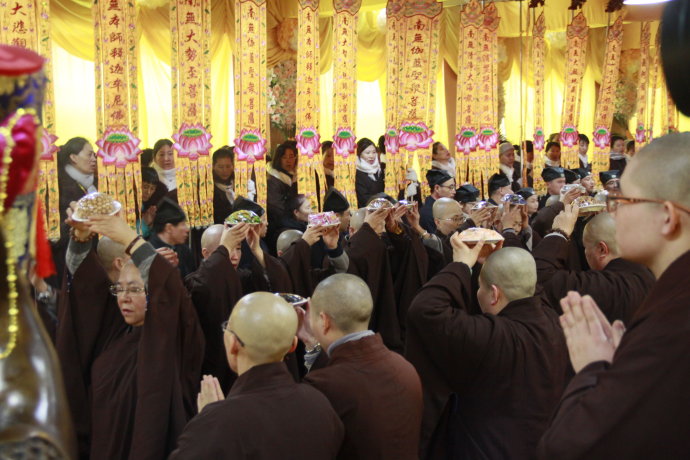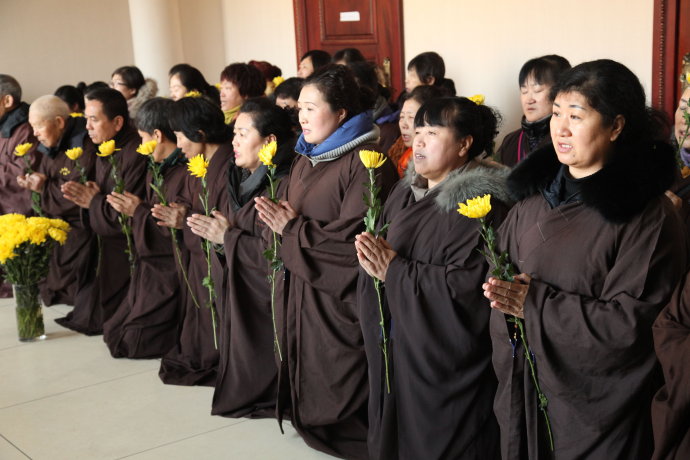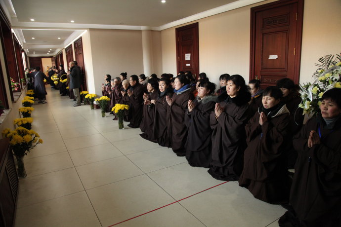 从老法师法体所在的寮房到三圣殿仅仅二百米的路程,但对僧众莲友而言却是那么的漫长……大众无不为果成老法师救度末法众生的悲心切愿深深感动,为老法师不为自己求安乐,但愿众生得离苦的济世情怀所感动。伴着一路鲜花瓣雨和声声佛号,老法师的法体圆满安放至追思堂。