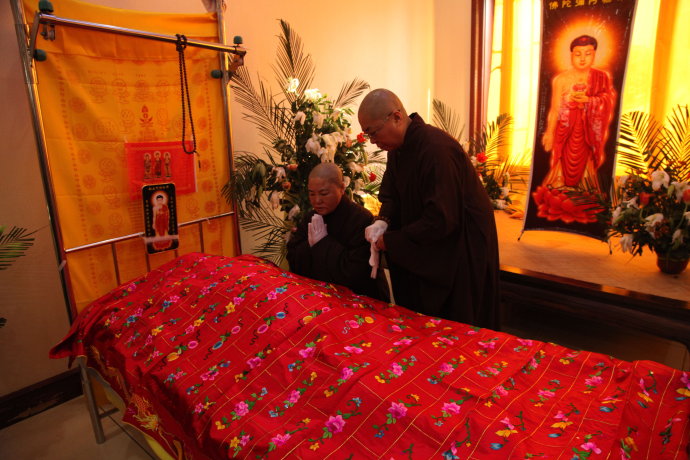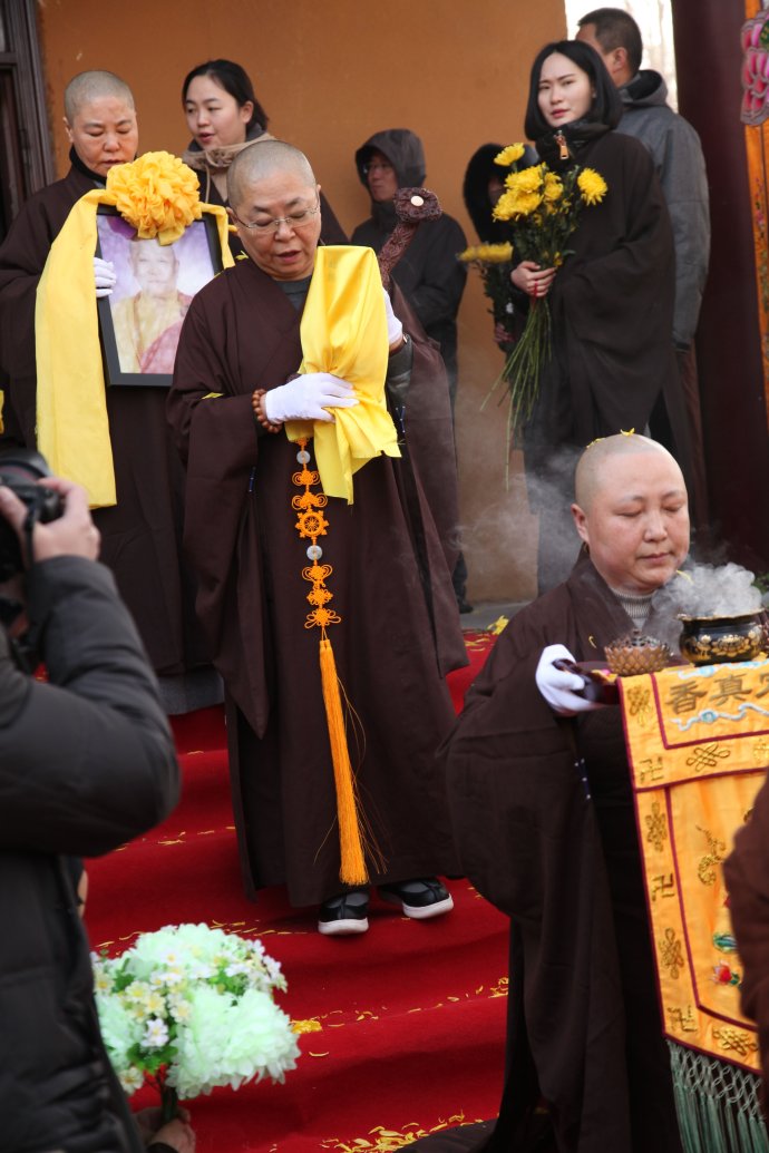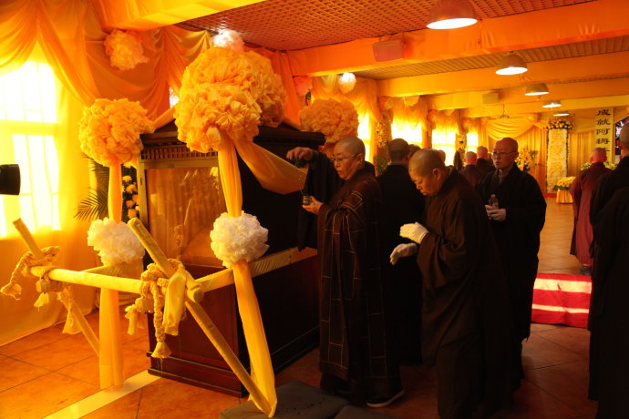 随后,在大众嘹亮的佛号声中,衍天法师率迎请队伍缓步来到老法师法体所在的寮房。寮房外钟鼓齐鸣,幢幡漫漫,寮房内檀香阵阵,梵音缭绕。四众弟子怀着无比虔诚、恭敬的心恭迎老法师的法体。