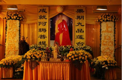 追思堂内,老法师的法体周围摆满了鲜花,老法师法像上慈祥的笑容带给人们清净与安详。