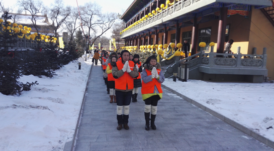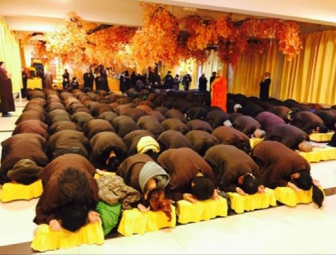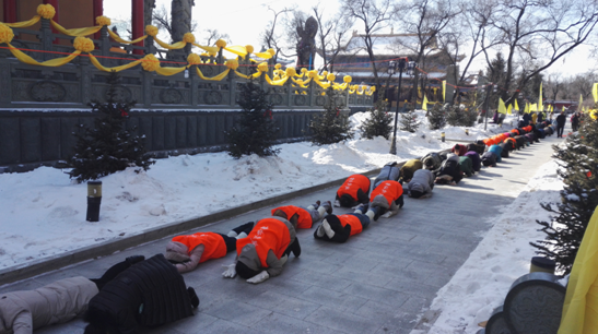 随后,近百名信众在法师的带领下威仪整齐地在三面观音像前集合,在“阿弥陀佛”的佛号声中,开始了果城寺院内拜忏。虽然天寒地冻,路面坚硬,但大众依然一丝不苟地在佛号声中,跟 随着法师,三步一拜,坚定前行,嘹亮的弥陀圣号回荡在整个寺院,不绝于耳。每个人的心中都有一个坚定的信愿,那就是代上果下成老法师挚诚忏悔无始劫来所造的罪业,并祈愿上果下成老法师在三宝的加持下,业障消除,蒙佛接引,速速往生净土!