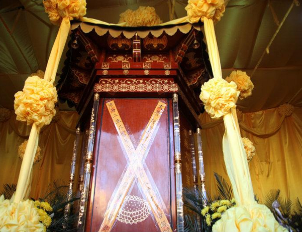 追思法会后,在庄重的梵呗声中,由本英大和尚、明宽大和尚和觉航大和尚共同主法为上果下成老法师启建隆重的法体坐龛及封龛法仪。