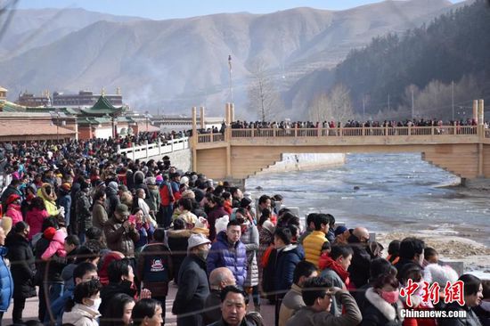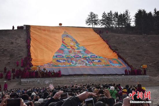 2016年2月20日,农历正月十三,有着“世界藏学府”之称的甘肃拉卜楞寺举行了一年一度的正月晒佛节。当天,伴着蓝天白云和温和的阳光,覆盖在巨幅佛像唐卡上的黄色丝绸缓缓拉开,巨大佛像出现在拉卜楞寺前的晒佛台上,引得数万藏族民众及游客纷纷赶来瞻仰神圣佛容。 拉卜楞寺位于甘肃省甘南藏族自治州夏河县,是藏传佛教格鲁派六大宗主寺院之一,始建于1709年,迄今已有300多年历史。每年自农历正月初三开始,拉卜楞寺都要举行一年一度的正月法会,晒佛法会是正月法会的重要内容之一。
