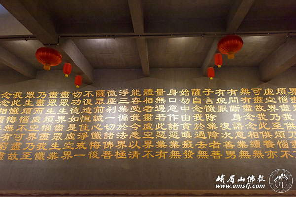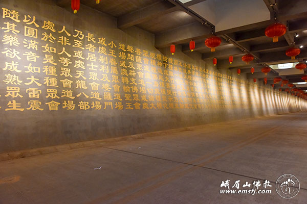 同时峻工的还有五百米长的加持大道。该加持大道贯通东西大门,两面经墙分别印《金刚经》《普贤行愿品》,近11000字,经文采用隶书,每字半米见方,涂以金漆,当灯光照亮,经文金光闪耀,普照十方。查现有资料,单一经文之经墙尚未见出其右者,此经墙或为当世最长之经墙。凡以虔诚恭敬之心经此大道者,经过一次皆为诵读经文一遍,有无边功德,必得诸佛菩萨加持,得明心见性、事业成就之善果,故此大道称加持大道。