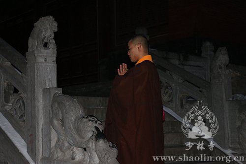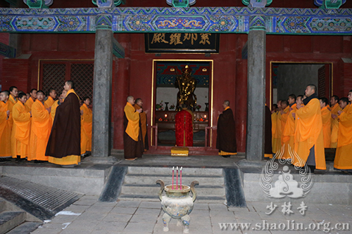 为了纪念护法神紧那罗王,少林寺举行隆重的上供祈福法会。是日晚六时,在方丈永信法师的带领下,少林寺两序大众云集紧那罗王殿,共同祈愿在新的一年中,世界和平,人类幸福,国泰民安,正法久住。