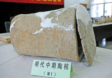 “每件陶棺都有白和尚、老和尚本师、惠和尚等字样。”据介绍,这批陶棺均为灰陶质,棺盖用建筑材料滴水瓦代替,一种是兽头滴水,一种是花卉滴水。棺盖顶部有三种形式,一种为素面带墨书,一种为线刻带墨书,一种为线刻。