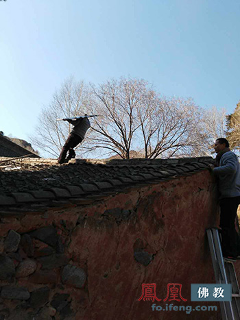 志工修缮房顶(图片来源:凤凰佛教)