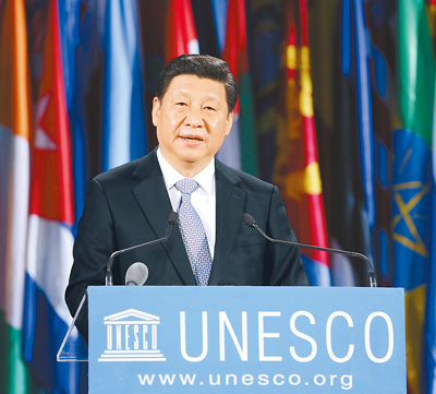 国家主席习近平在访问联合国教科文组织总部时发表演讲(图片来源:新华社)