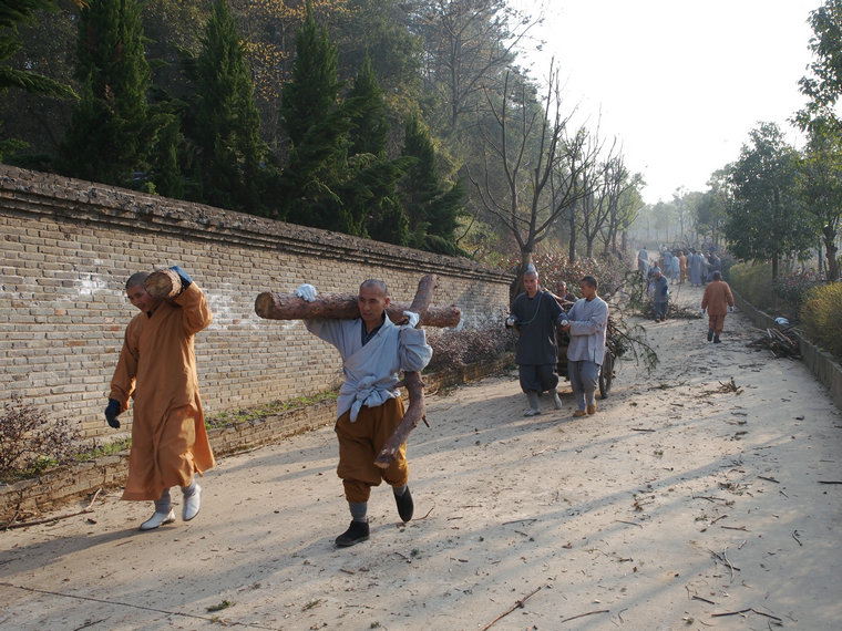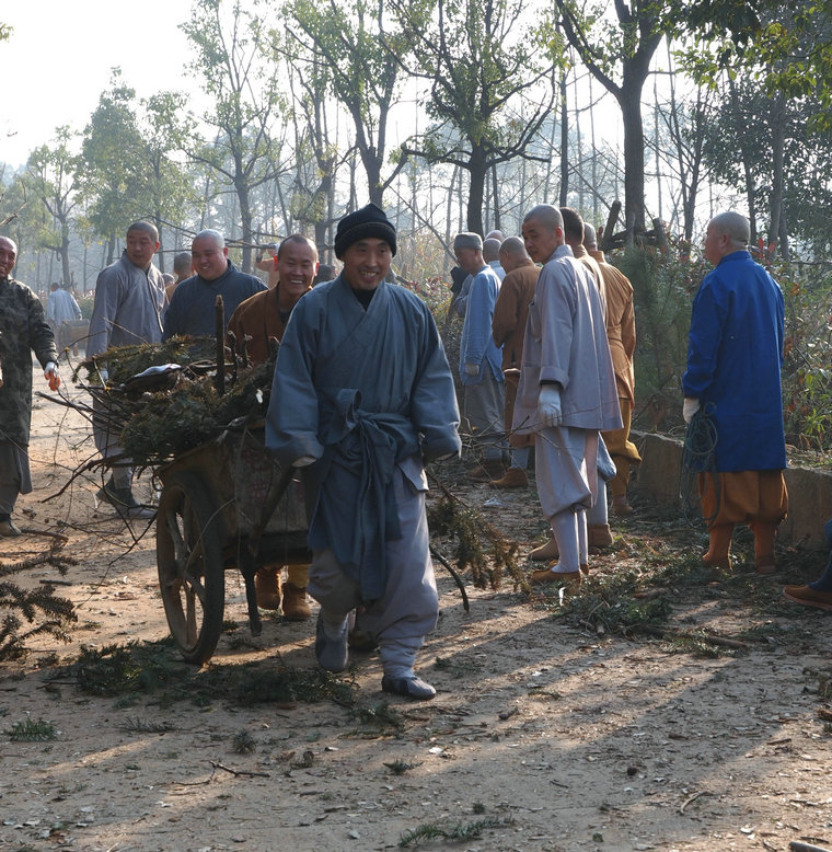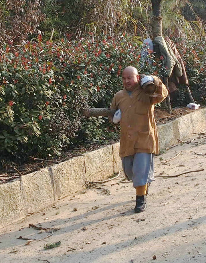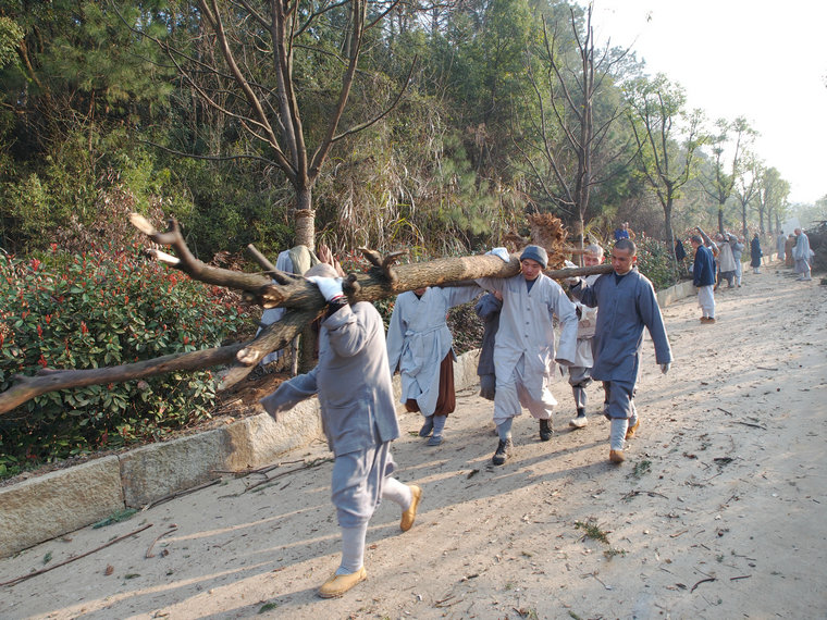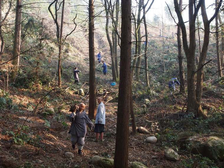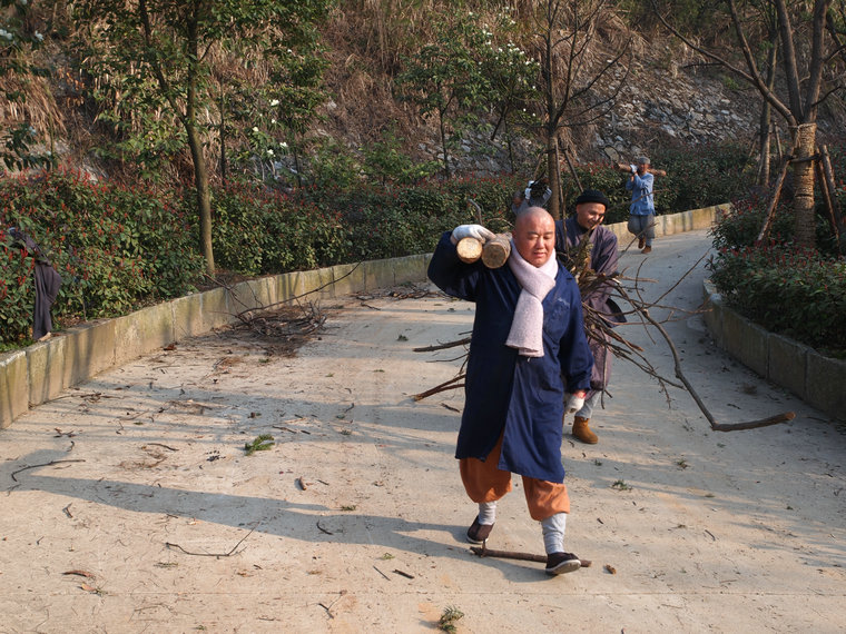 2016年2月29日,祖庭后山上春和景明,数百位出家师父于早斋后在这里集体出坡,收集、清理各处散落的枯树残枝、废弃木材,将其运送到海会堂处新建的柴房储藏起来,留作它用。
