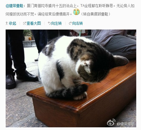 在厦门南普陀寺拜佛听经的喵星人(图片来源:微博)