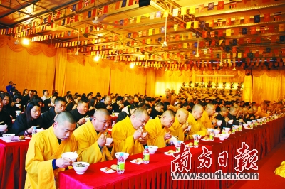 整齐的近10排桌椅上,桌子上的碗靠近桌子的外沿摆放,行堂的义工沿着桌子走,把每种食物都在碗里装上一点,数百名身穿僧服的僧众与身穿海青的信众同台食斋,会场气氛肃静,食斋的僧众与信众均不出声,以特定的手势示意是否添加食物等,这一过程,只能听见照相机偶尔的咔嚓快门声……