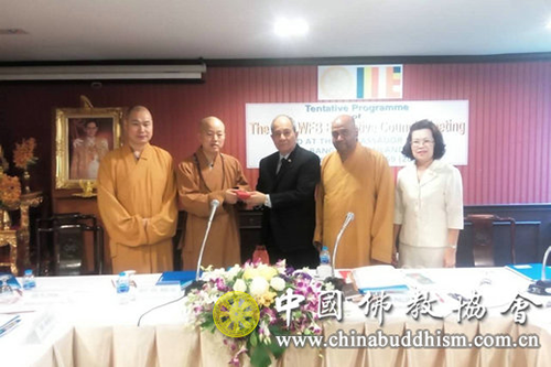 应世界佛教徒联谊会潘·瓦那密提主席邀请,中国佛教协会副会长明海法师,中国佛教协会国际部主任、世界佛教徒联谊会中国执委普正法师出席会议。明海法师代表中国佛教协会向世界佛教徒联谊会总部捐赠壹万元人民币。