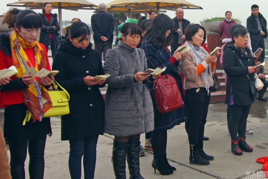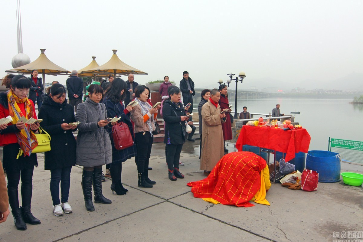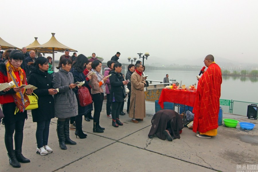 2016年3月5日,湖北省襄阳市,一群善男信女在广德寺高僧的带领下举行佛教放生法会。