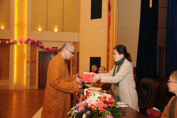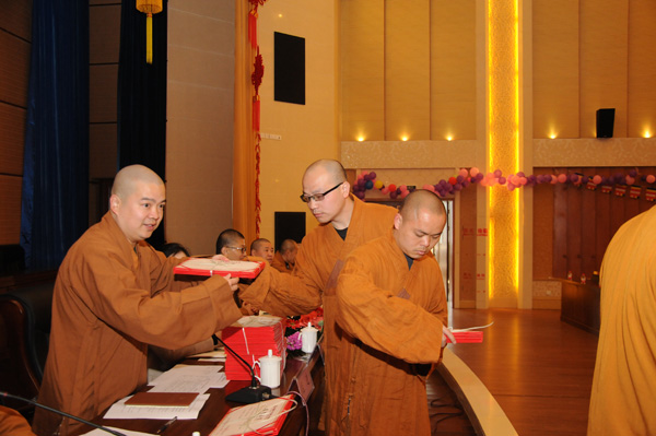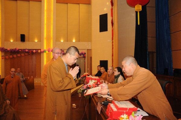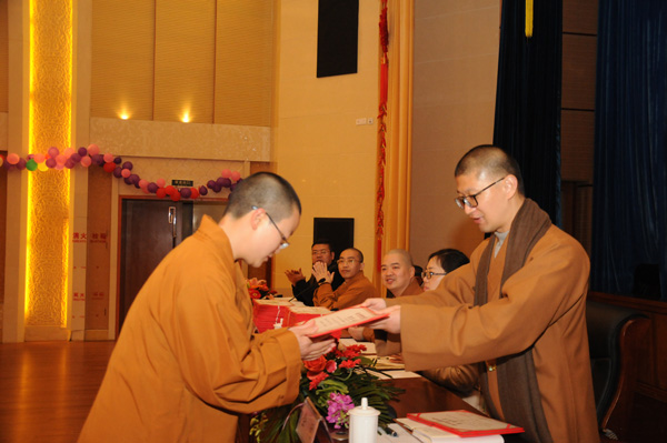 典礼伊始,能进法师宣布了2016年妙善奖学金、发心奖、修持奖、全勤奖获奖者名单,与会领导分别为获奖学僧颁发了获奖证书。
