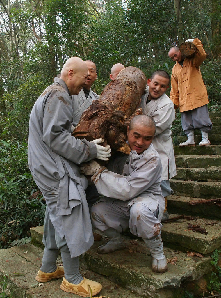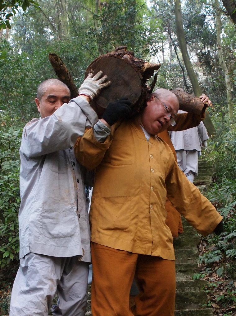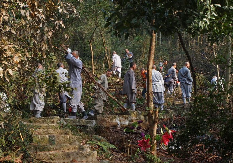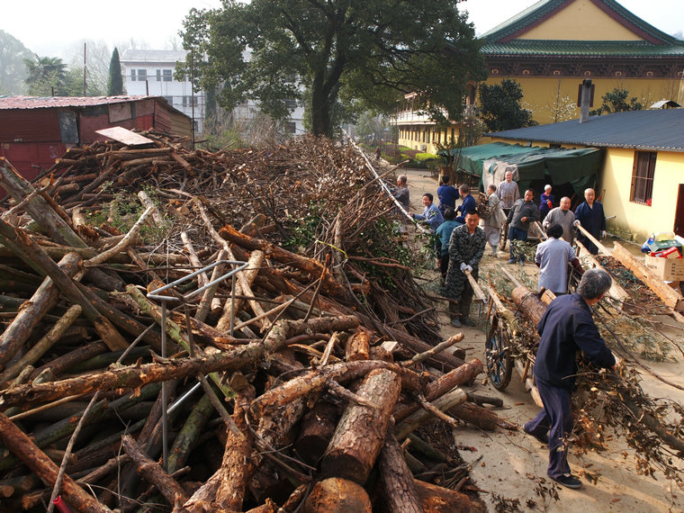 在春日暖暖地阳光中,在道友们心中朗朗佛号地加持下,缁白二众不怕脏累,同心协力,尽心尽力地为庄严道场而劳作。大众收集、清理电工房后面一带山坡的废置木材与干枯树枝,并运送至大寮后面堆放起来。