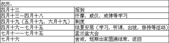 法会共三个月,按照正式出家规范进行,分三期进行。发心者也可连续三期参加: