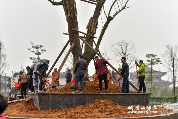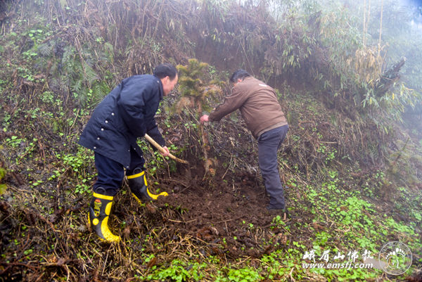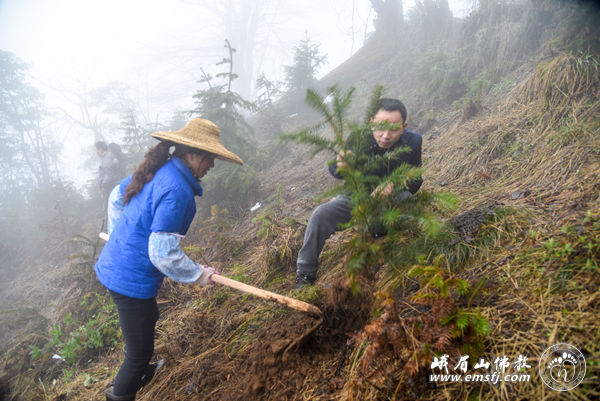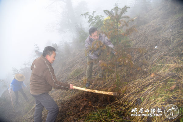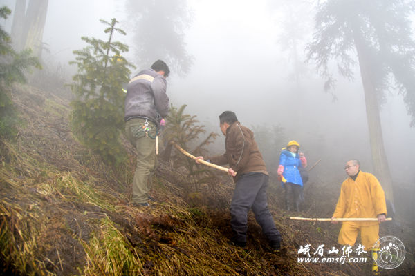 3月12日,又逢植树节,峨眉山僧众冒着蒙蒙细雨,在寺院内外、山坡平地植下一颗颗树苗,为峨眉山生态文明建设植树添绿。在大佛禅院,永寿大和尚带领大众移植了一株蓝花楹树;在仙峰寺,僧众员工们植下了五十多株杉树……他们挖坑、栽苗、培土、踩实,大家有说有笑,动作熟练,配合默契,劳动繁忙而有序,气氛活泼而热烈,力争为名山建设贡献自已的一份力量。