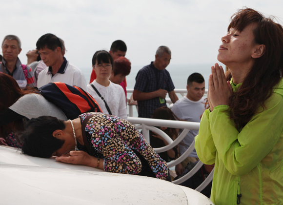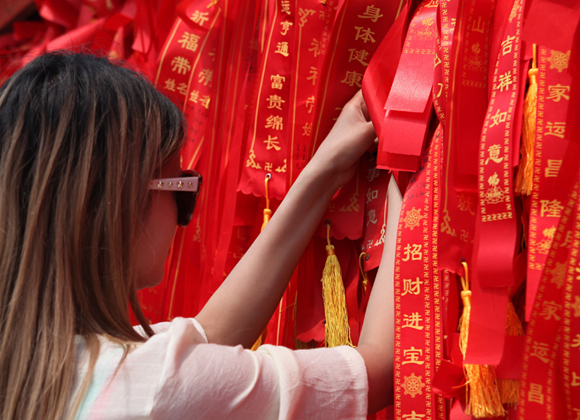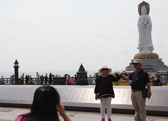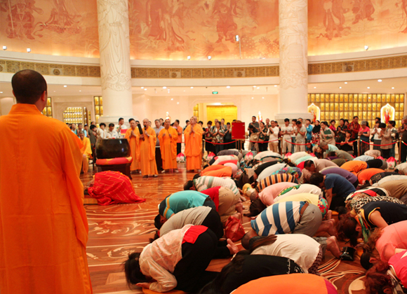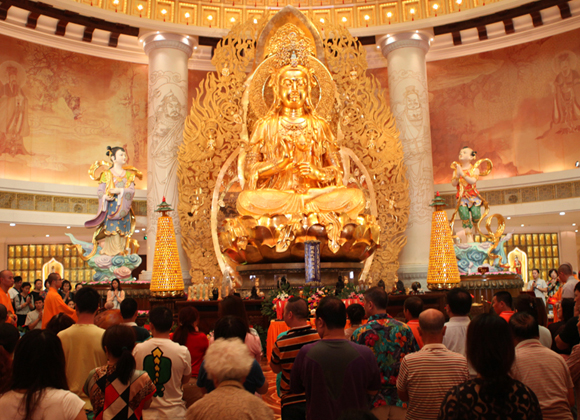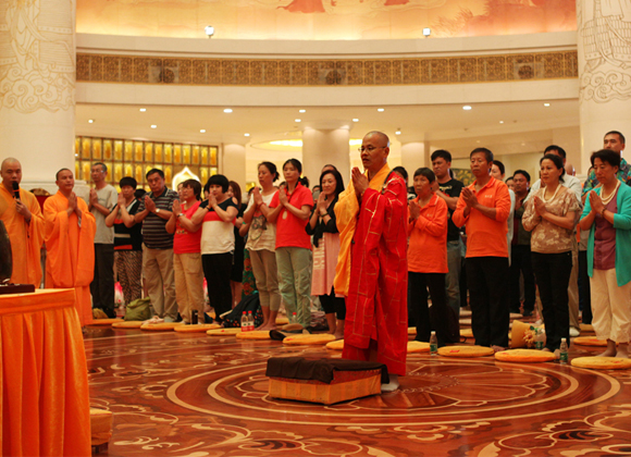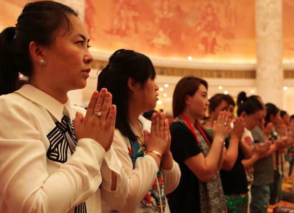 上午10:20,圆通宝殿内的信众们双手合十列于圣观音前恭迎法师到来,坛场外的游人也都怀着恭敬心双手合十,共沾法喜。