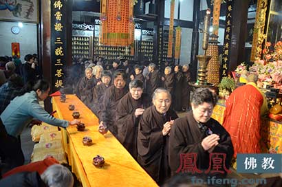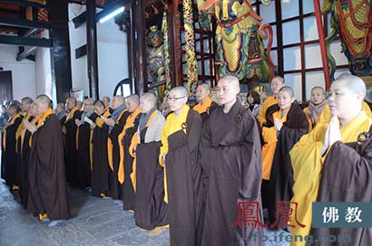 为感念观音菩萨胜德,法师信众们齐诵《大悲宝忏》和《观音宝忏》。(图片来源:凤凰佛教)
