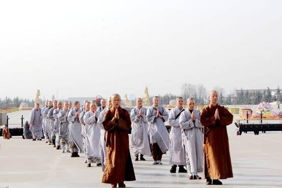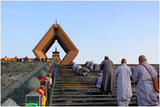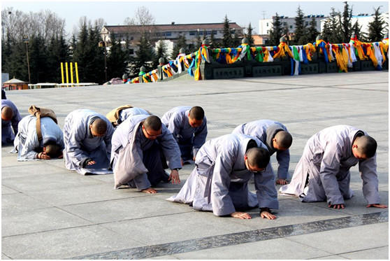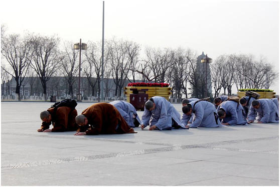 到达法门寺后,分组列队排班,法师在前,学僧随后,从法门寺合十舍利塔前的广场台阶起拜,三步一拜礼向真身指骨舍利所供奉的殿堂内。