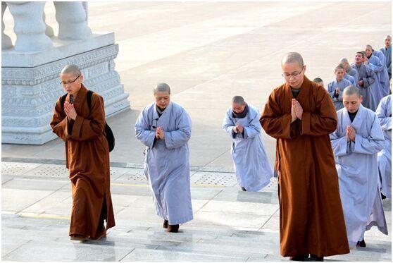 2016年3月13日,法门寺佛学院女众部全体学僧在各班班主任的带领下,三步一拜朝礼供奉在法门寺合十舍利塔地宫内的释迦牟尼佛真身指骨舍利。