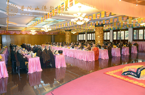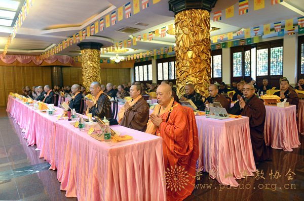 本次共修法会坛场设在普济禅寺大斋堂内。普陀山佛教协会会长道慈法师,副会长惟航法师、净旻法师、信光法师、智宗法师、门肃法师(兼秘书长)、会闲法师、定明法师等佛协领导,全山各寺院监院等执事,以及部分护法居士,共约600余人参加此次法会。