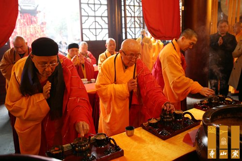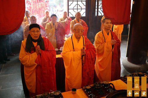 9时,寒山寺大雄宝殿内香云普盖,梵音绕梁。中国佛教协会咨议委员会副主席、常州天宁寺方丈松纯长老,中国佛教协会咨议委员会副主席、江苏省佛教协会名誉会长、无锡祥符寺方丈无相长老,山东省佛教协会会长仁昌大和尚,江苏省佛教协会副会长能修大和尚、江苏省佛教协会副会长普仁大和尚等诵经祈福,于佛前拈香礼佛,来自寒山寺、重元寺、白鹤寺、寒山书院、清凉书院的法师以及性空长老弟子、寒山书院历届学子三百多位法师,齐颂诸佛菩萨圣号,在佛前大供,为性空长老九十五华诞祈祝寿。