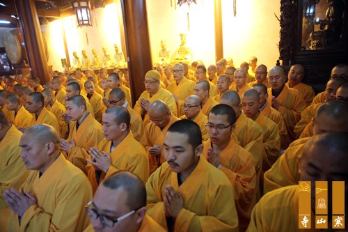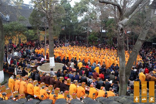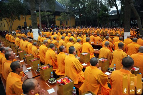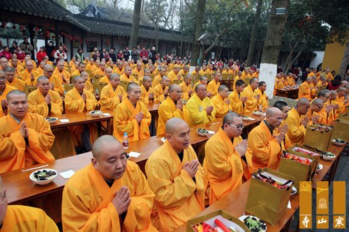 祝寿庆典结束后,秋爽大和尚及所有参加法会的法师于寒拾殿前过堂,举行上堂大斋,念诵供养咒,供养诸佛菩萨。
