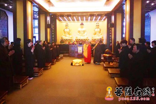 下午1时30分,道元法师带领两序大众在大雄宝殿礼佛,口诵真言,供养诸佛教法,以杨枝洒水,清净丛林,以期法会清净庄严,遣除违缘,教化六道众生,广结善缘。正如太虚大师所言,乃佛初成佛时妙觉光中所顿辉重重无尽之远近因华行、自他妙严境也。由佛智以观之,则一切皆为佛境,故众生皆如来功德智慧之相,而国土皆莲华藏海庄严之刹。此现证界,非身非言,而遍一切,即身即言。