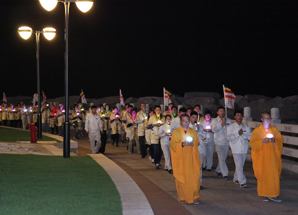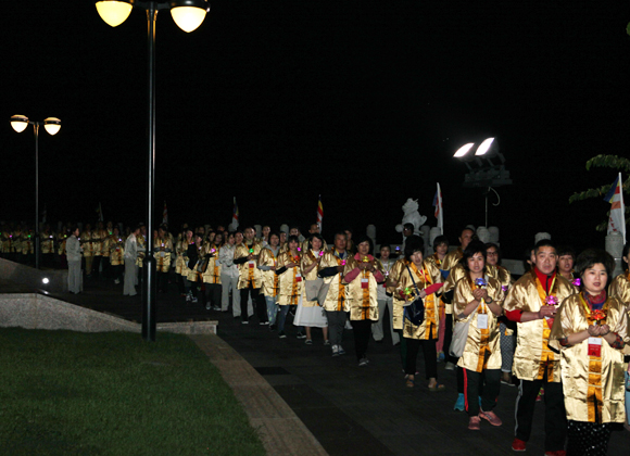 20:50,观音岛上一片安宁祥和。此刻,四众弟子手捧七彩莲花灯,在法师的带领下进行殊胜的绕佛仪式。