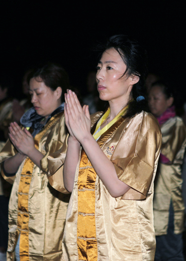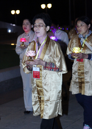 僧众分成两行纵队,手捧莲花灯,边走边唱诵“南无大慈大悲观世音菩萨”名号,在月光下缓缓而行,远远看去,似一朵朵莲花在菩萨菩萨身边盛开。