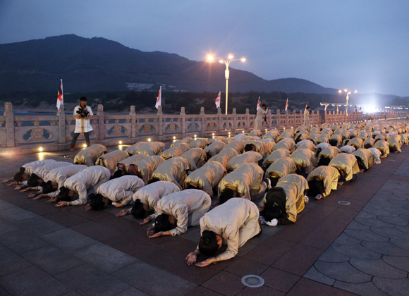 善信们将内心坚固的信愿融为一个个恳切的匍拜,整个朝拜富有节律,起伏有度,在祖国最南端的道场上演绎出了一幅庄严的画面。