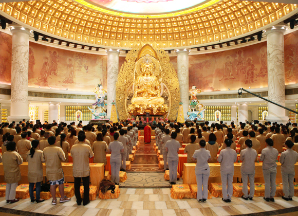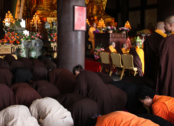 “拜佛,是以我们最尊贵的头顶礼佛最卑下的足,称作「接足礼」。此修学的目标,在断除我们骄慢(骄傲、怠慢)的习气。我们从早到晚见一切人、一切物,就像对佛一样尊重,以尊重佛的心去尊重一切众生,这才能成就平等心。”